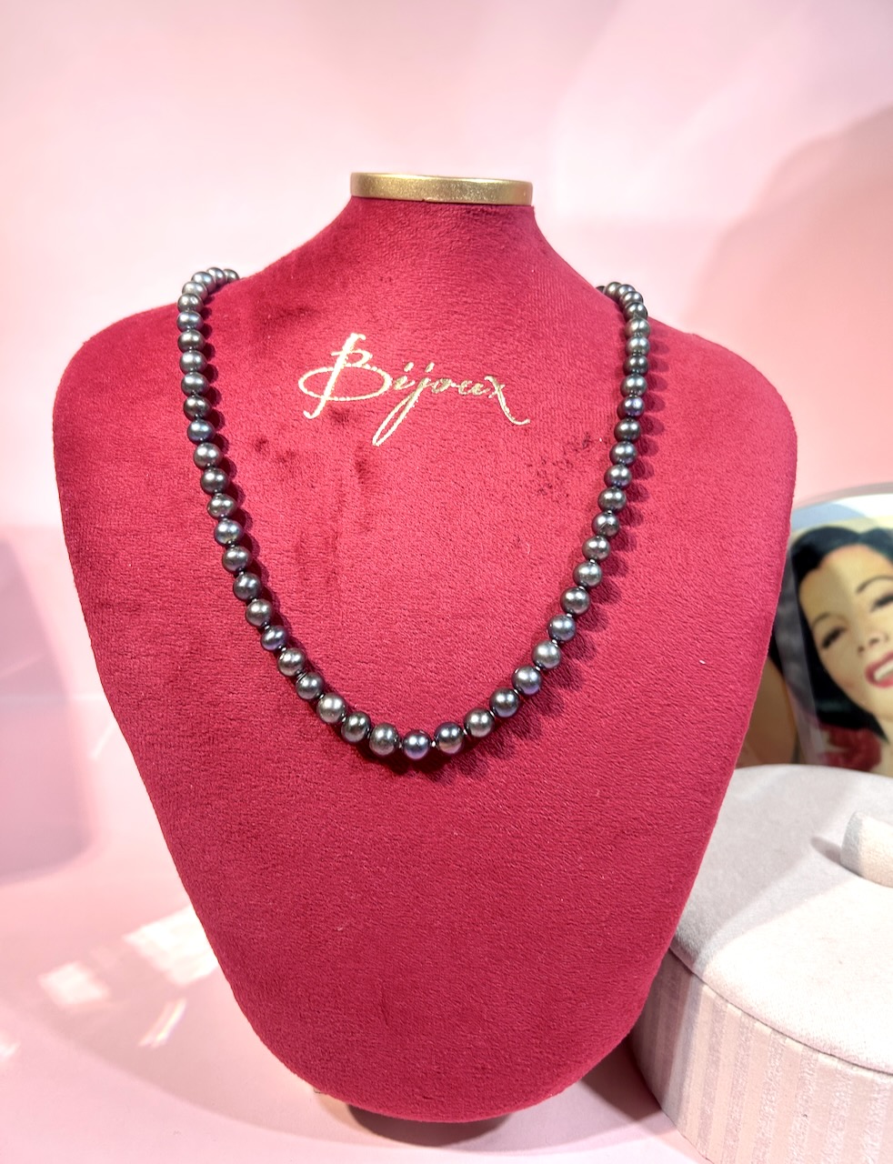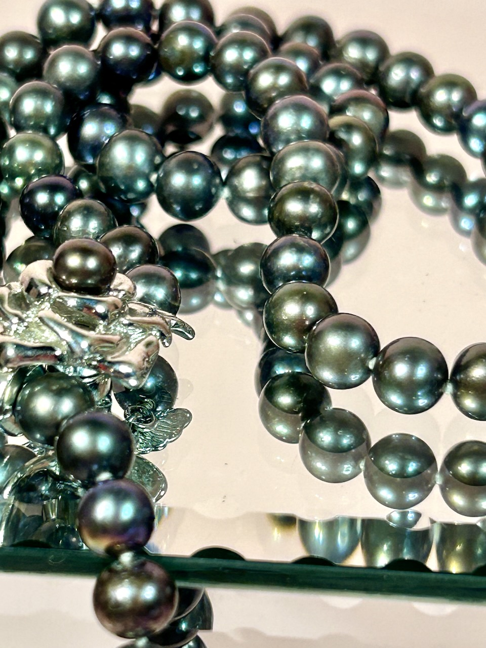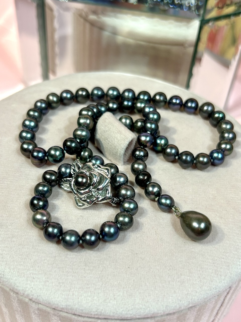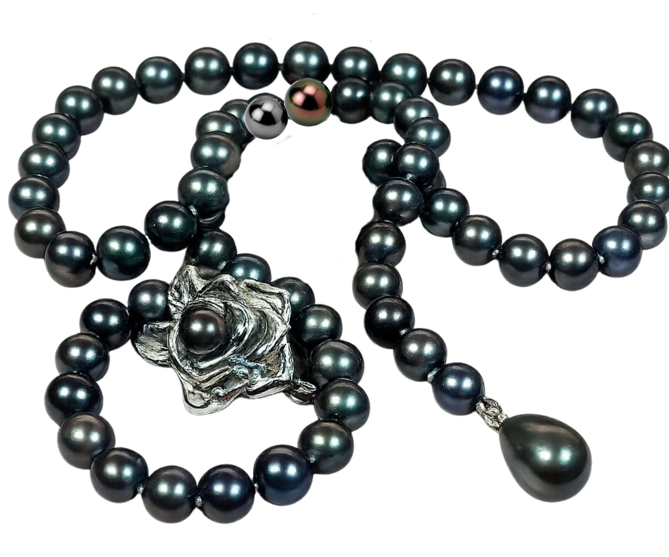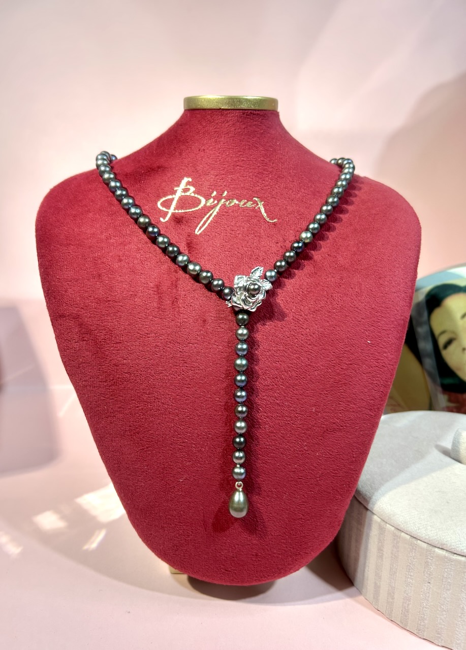 Eleganckie czarne perły słodkowodne z ozdobą.