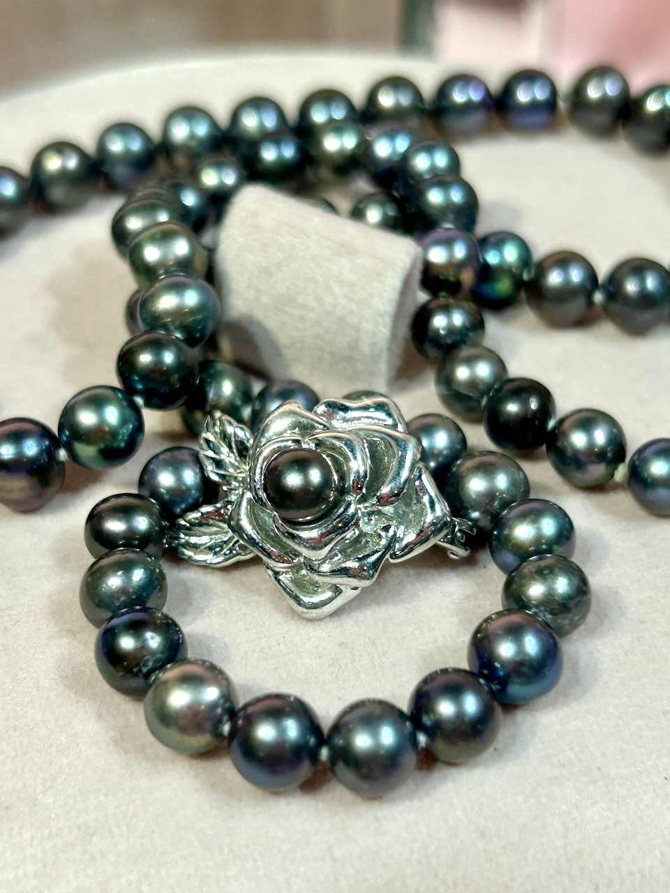 Naszyjnik świetnie zaprojektowany z pięknym zapięciem ze srebra w kształcie róży, ozdobionej dodatkową perłą, który pełni także funkcję skracacza - można upinać naszyjnik na dowolnej długości.