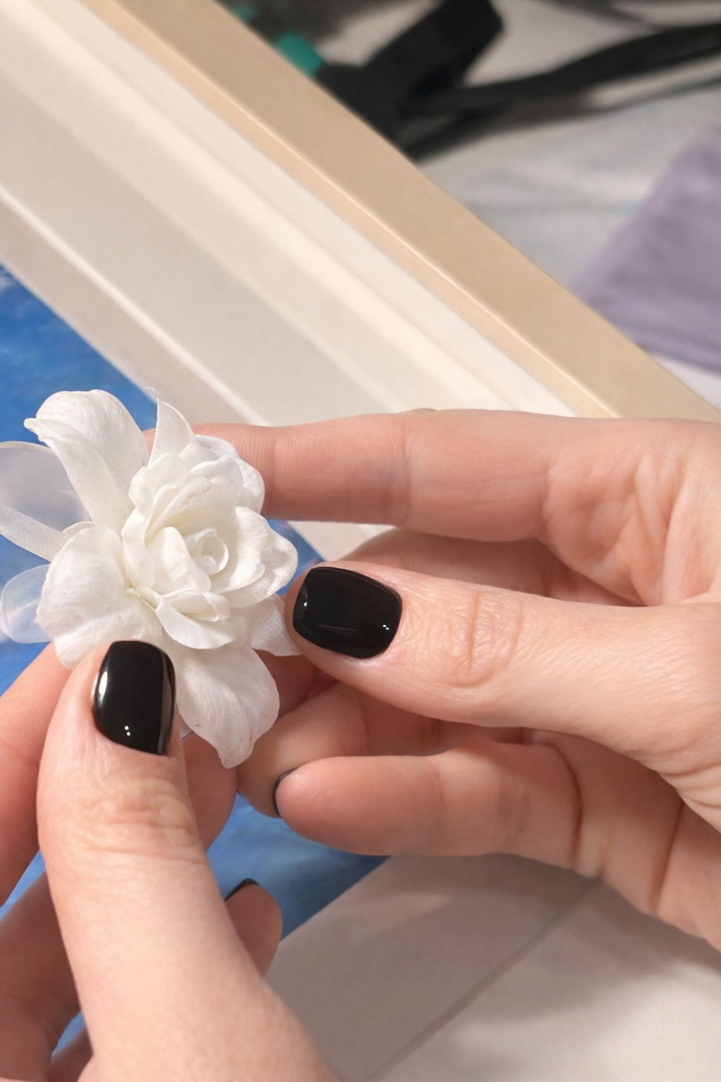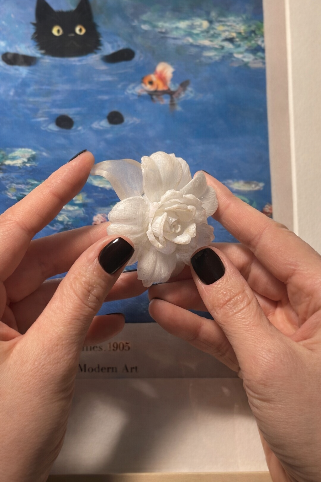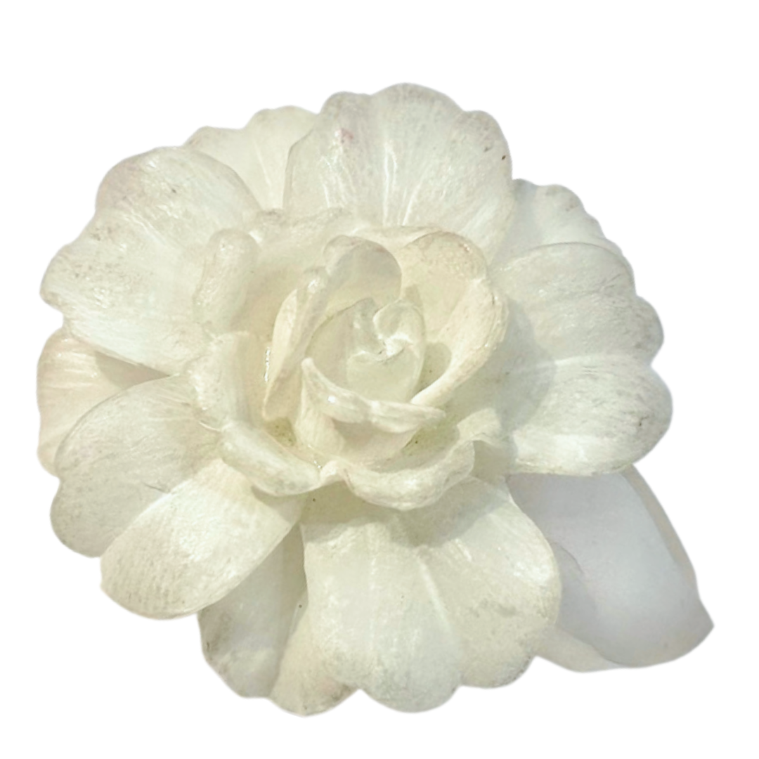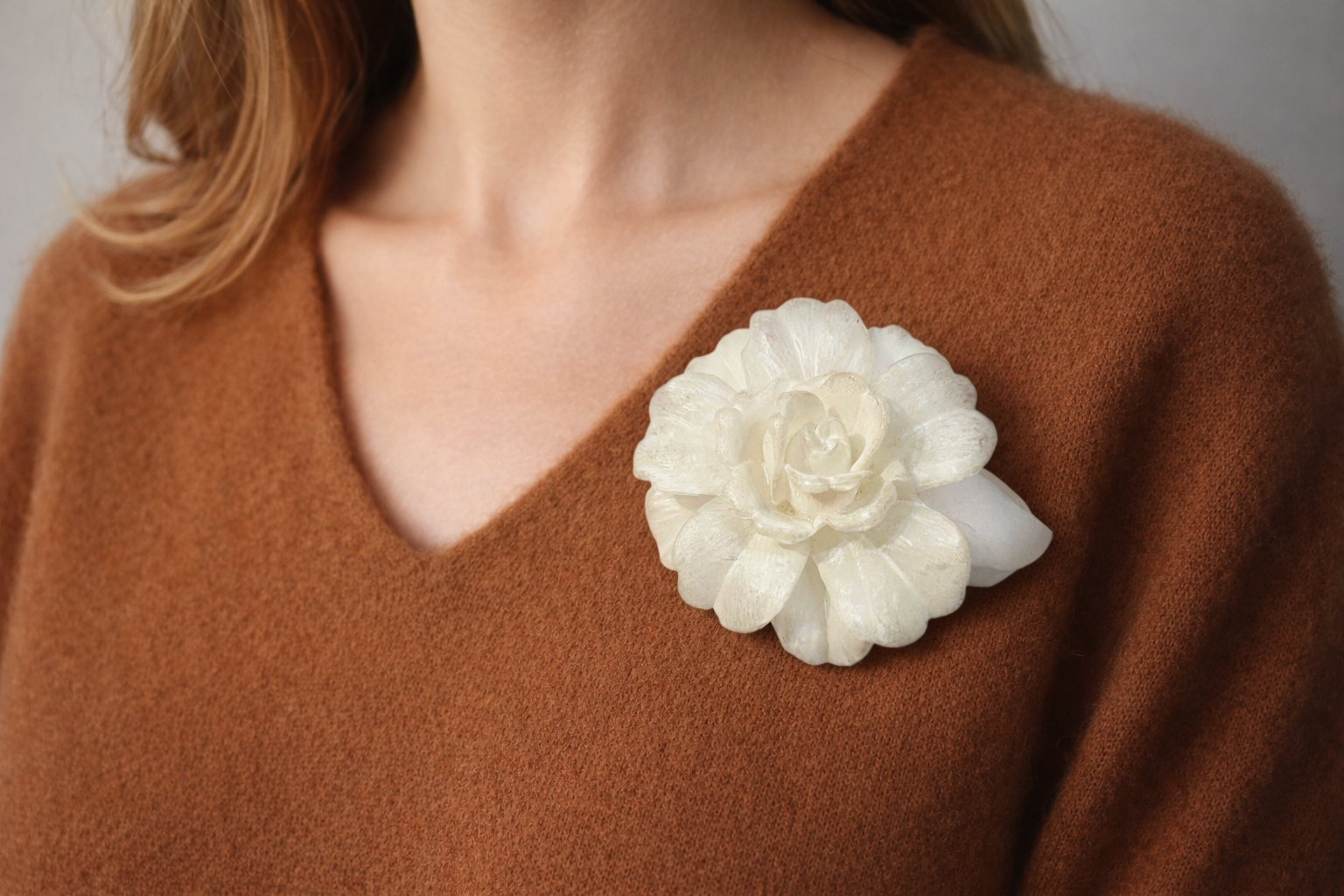 Broszka wykonana z akrylu, pokryta satynową powłoką, sprawia wrażenie białej róży na mroźnym powietrzu, kiedy to płatki pokrył szron.