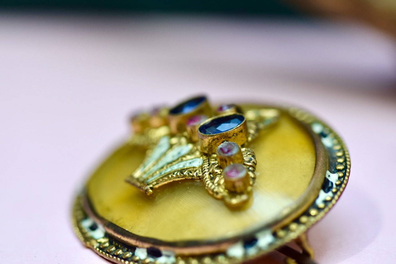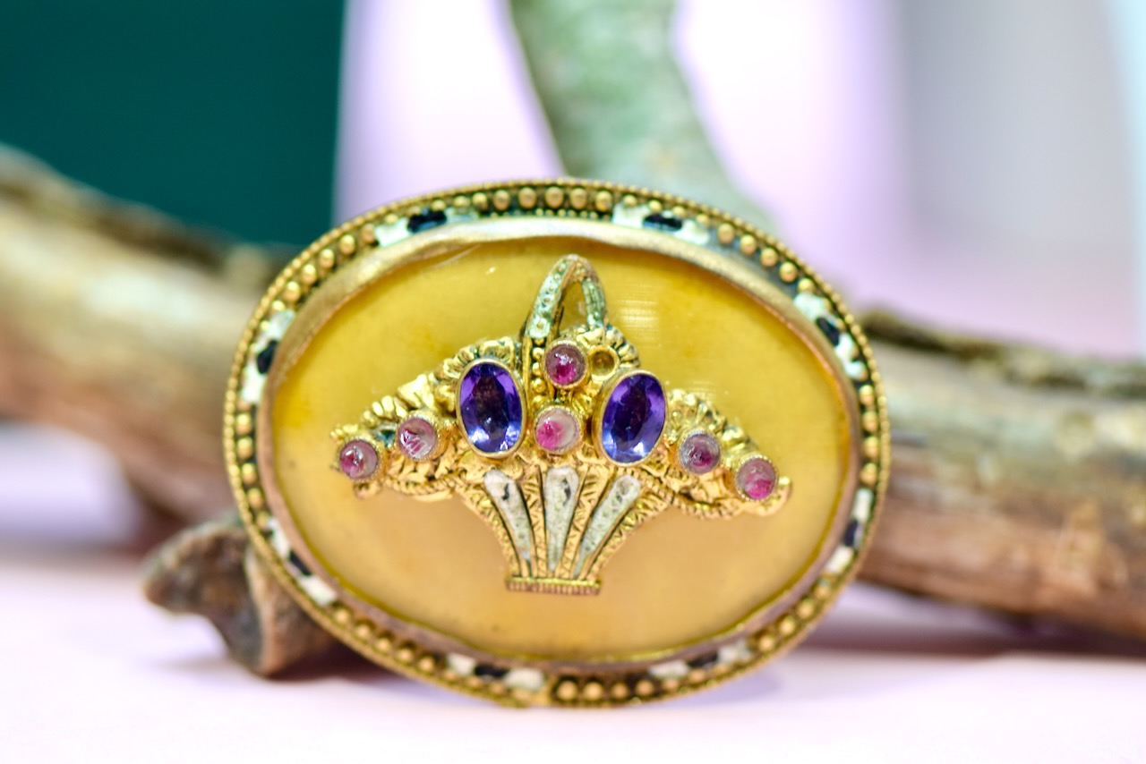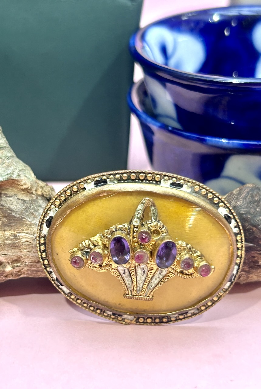 XIX-wieczna broszka w stylu edwardiańskim, utrzymana w dekoracyjnej, a zarazem eleganckiej formie inspirowanej motywem kosza kwiatów. Wykonana z pozłacanego mosiądzu, zdobiona emalią oraz naturalnymi kamieniami – ametystami i rubinami, które tworzą harmonijną, barwną kompozycję o szlachetnym charakterze.