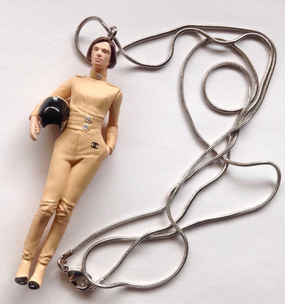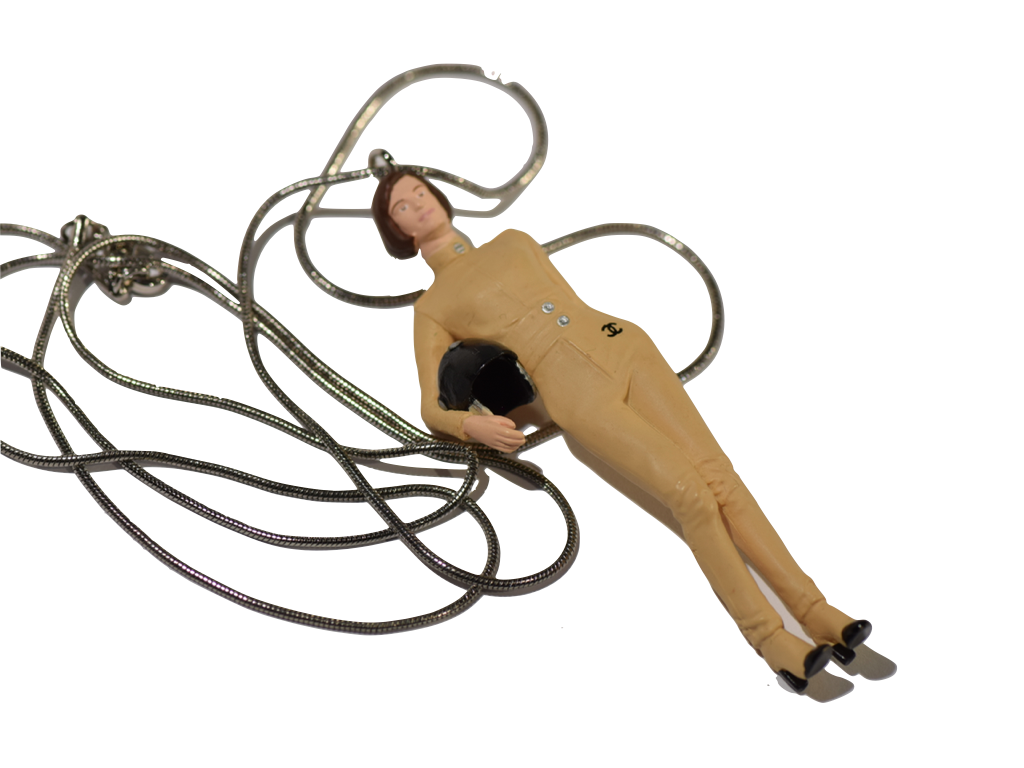 Naszyjnik Chanel przedstawiający lalkę inspirowaną Keirą Knightley z reklamy perfum Mademoiselle.