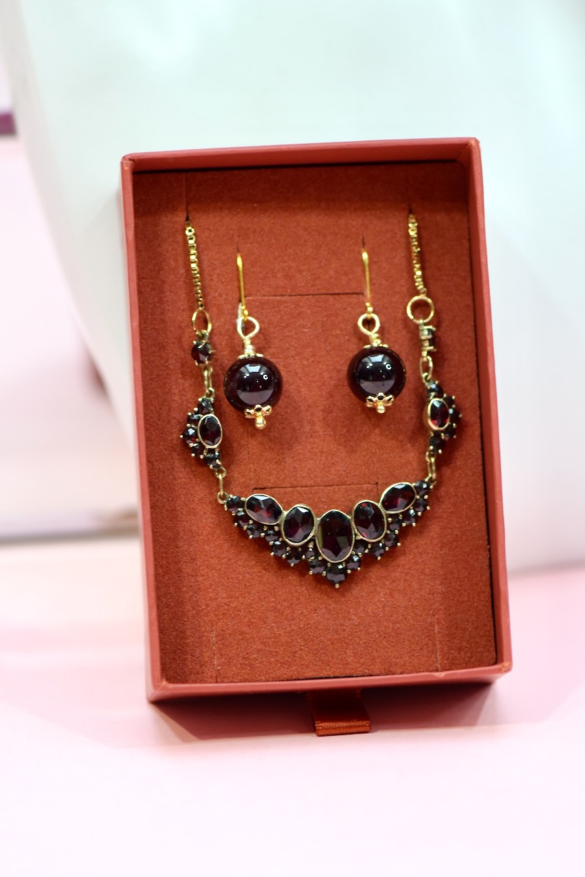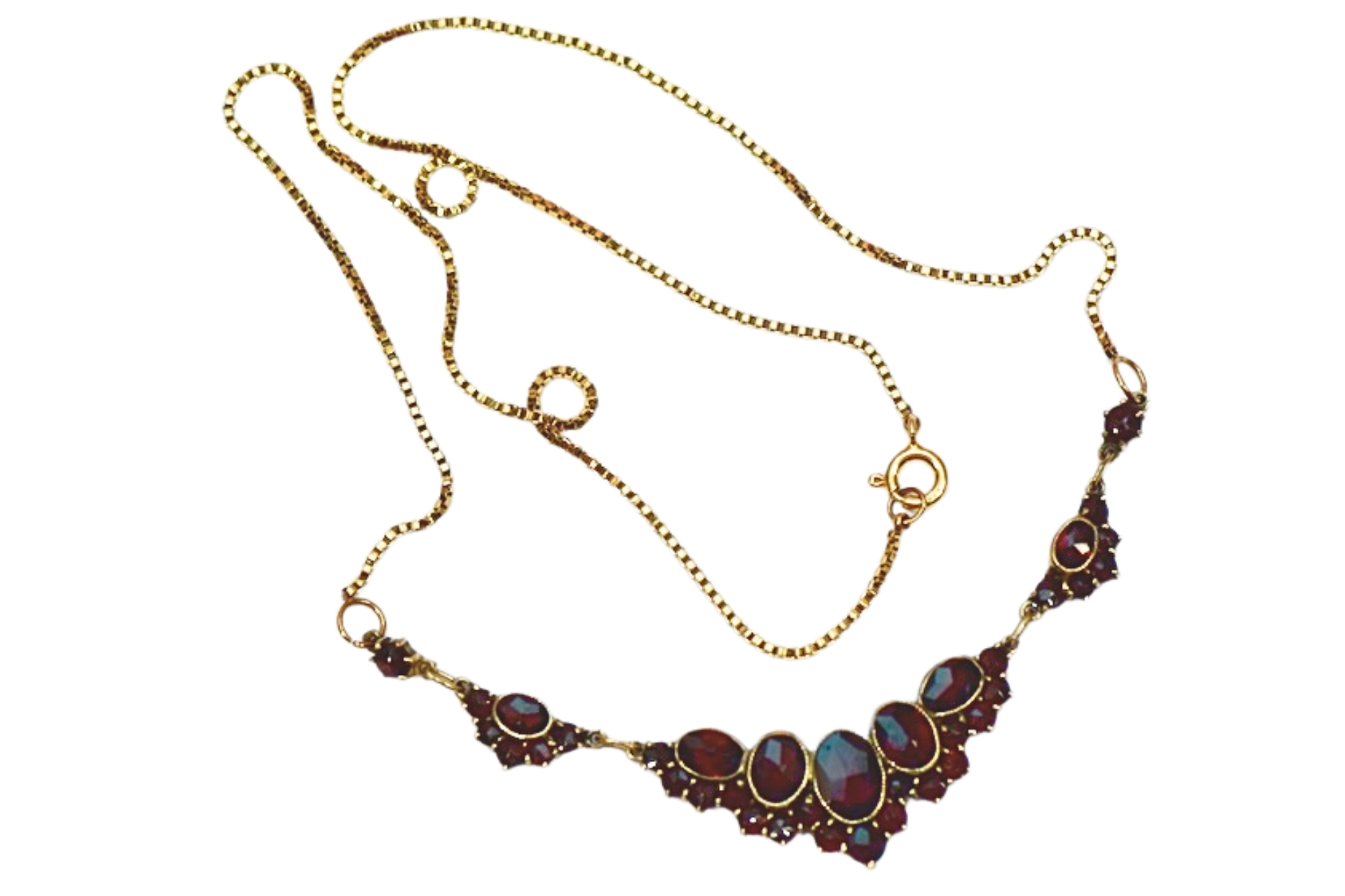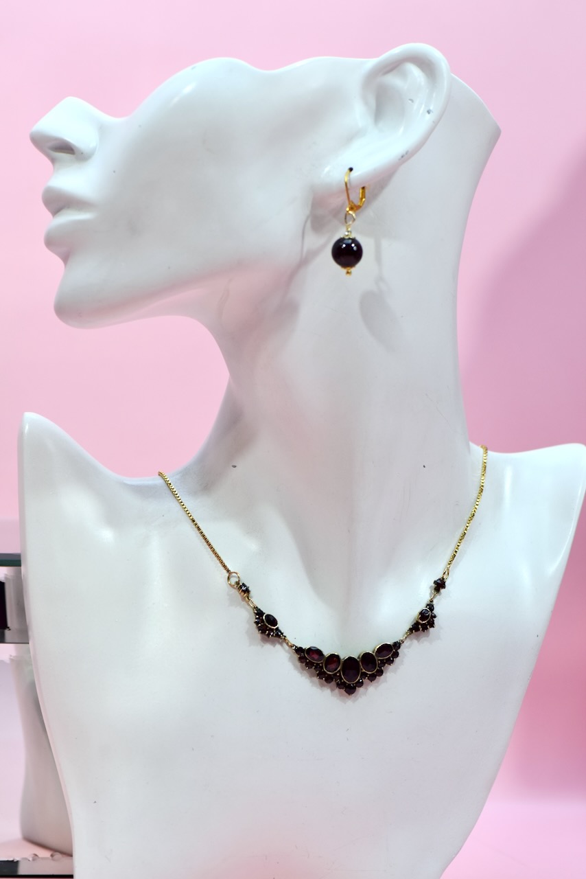 Naszyjnik na pozłacanym łańcuszku z częścią ozdobną składającą się z pięciu elementów, centralny najbogatszy ma formę trójkąta, bogato wysadzany jest naturalnymi granatami w starych szlifach i oprawie typu carga.