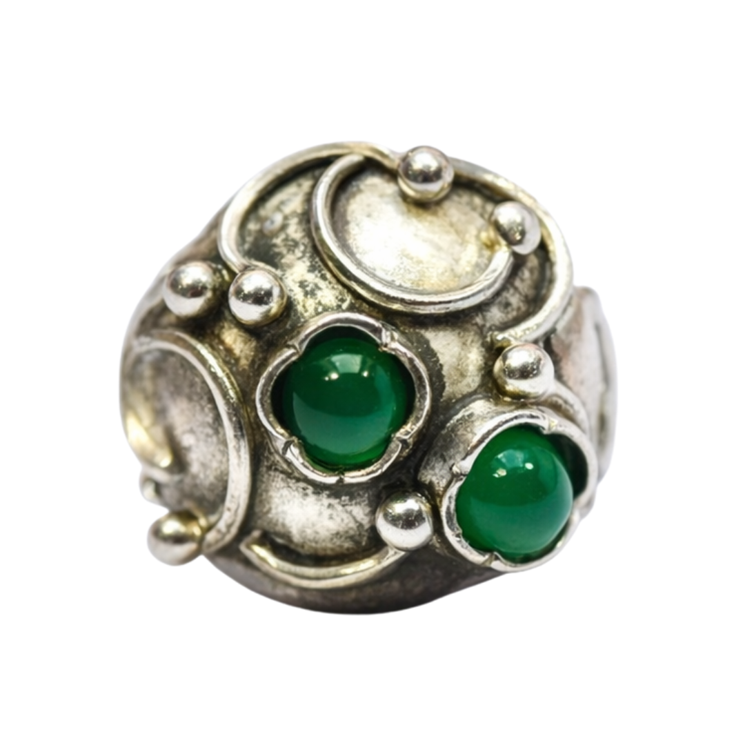 Wykonany ze srebra, ozdobiony chryzoprazem (w szlifie kaboszonu).