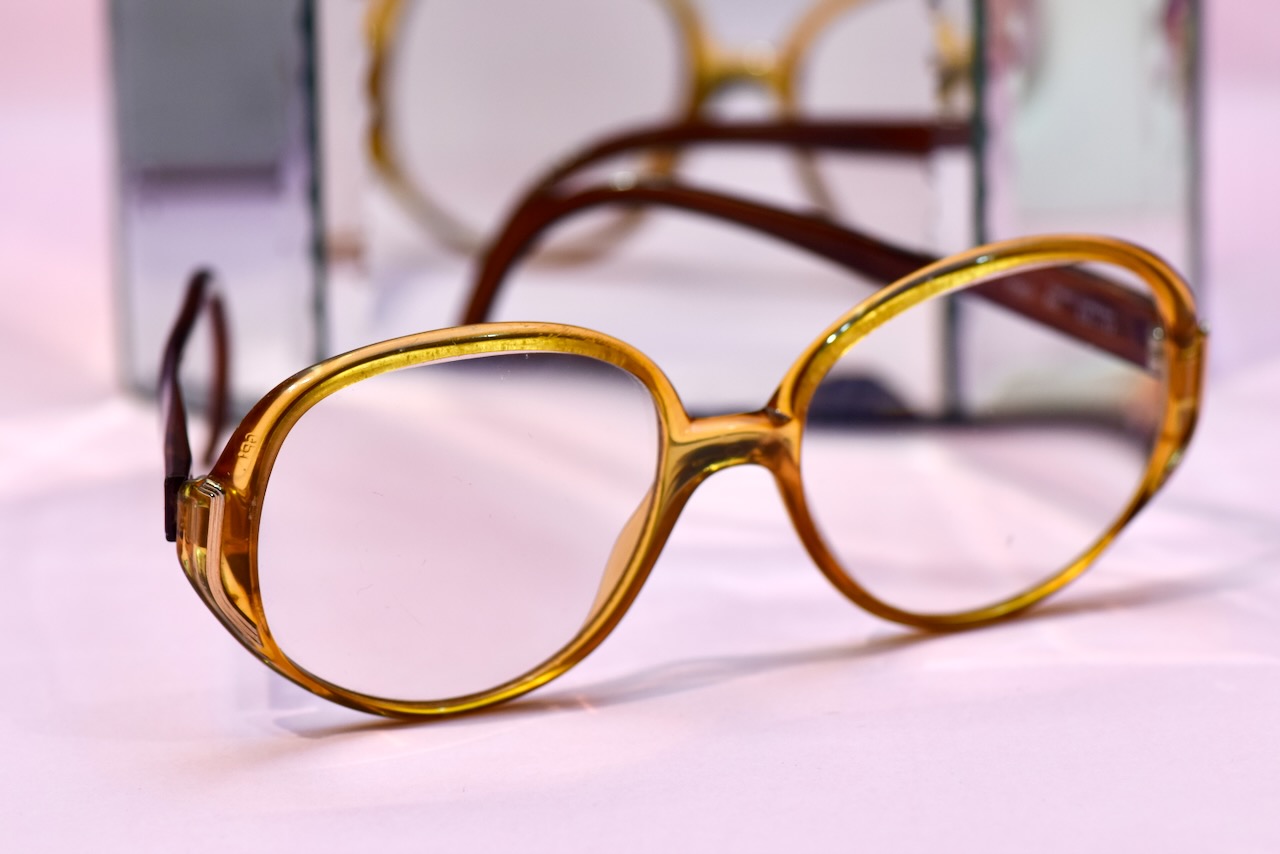 Charakterystyczne, duże oprawki okularowe w bursztynowych brązach.