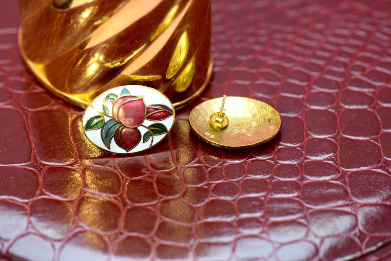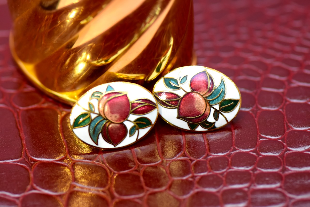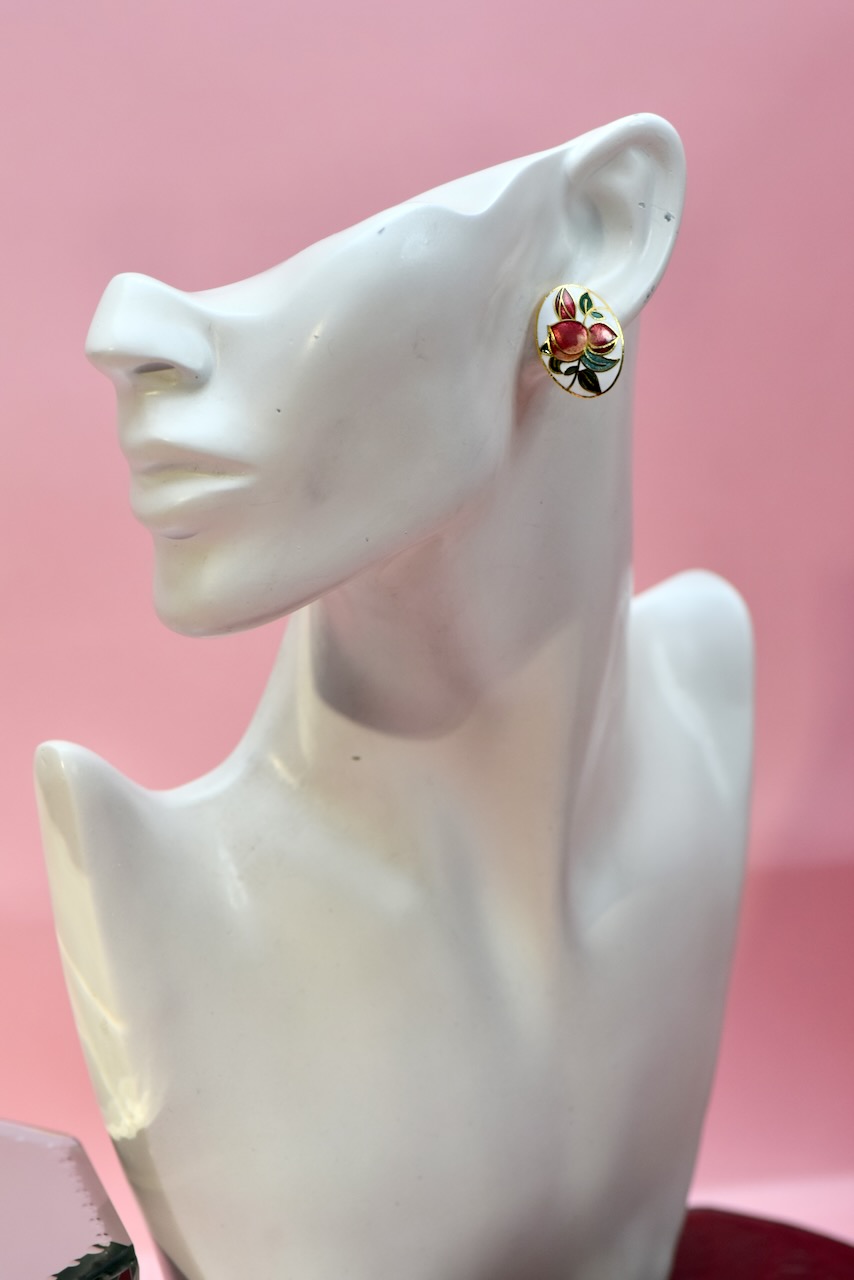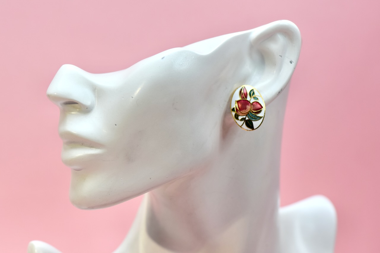 Owalne kolczyki w stylu vintage zdobione są dekoracyjnym motywem kwiatowym w odcieniach czerwieni i zieleni, osadzonym na jasnym tle.